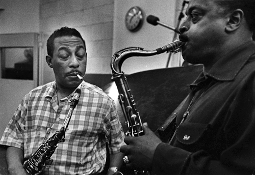Johnny Hodges and Ben Webster at a Charlie Parker/Norman Granz jam session. Los Angeles, California. 1952