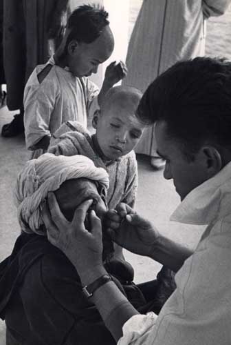 ![]() The courtyard in Tifoultout was used as a gathering place for people waiting for treatment. The team worker was taking a smear that was made into a slide and sent to a lab in Marrakech for analysis. Trachoma project. Tifoultout, Morocco. 1953 |